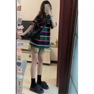 Polo neck striped ice silk short sleeve T-shirt women’s front shoulders